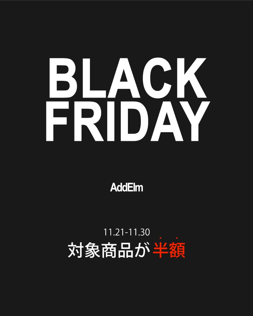 AddElm(アドエルム)|公式オンラインストアでは、11月21日(金)よりBLACK FRIDAYを開催いたします。対象商品が30〜60%オフとお得に購入できるチャンスとなるこの機会におぜひ買い求めください。商品一覧はこちらより:https://addelm.com/item